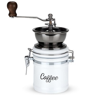 Few luxuries are more easily obtainable than freshly ground coffee first thing in the morning. Grind yours the old-fashioned way, with a high-quality handheld burr grinder that empties into a latched eggshell-white ceramic jar. For optimal care, run white rice through the grinder every few months. INSTRUCTIONS: Remove the top nut and lock ring. Hold the central rod and turn the adjust ring--turn clockwise for a finer grind, and counter-clockwise for coarse. Place the locking ring back in position to keep your grind setting steady. Place the handle on and secure it with the top nut.Feature