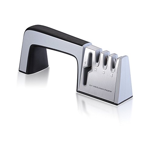 ★Both Knives and Scissors Sharpener: slot 1 is dedicated to scissor sharpening & slot 2 Coarse sharpening slot includes carbide blades that quickly sharpen dull or damaged knives with just a few pulls and slot 3 ceramic rods are ideal for finishing and polishing the edge, and are perfect for light touch-ups to an already sharp knife,slot 4 for ceramic knives and exact-grinding