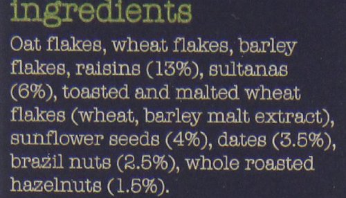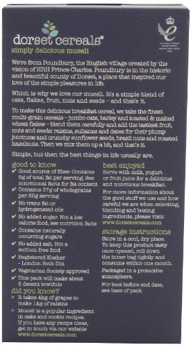 -. Feature : This pack will make about 5 servings each of 1/2 cup. / Ingredients include the finest multi-grain cereals; jumbo oats, barley and toasted and malted wheat flakes. Dates, brazil nuts and roasted hazelnuts are also included. / Best enjoyed with milk, yogurt or fruit juice. / Good source of fiber. / Product is made in Poundbury, England in the country of Dorset.
