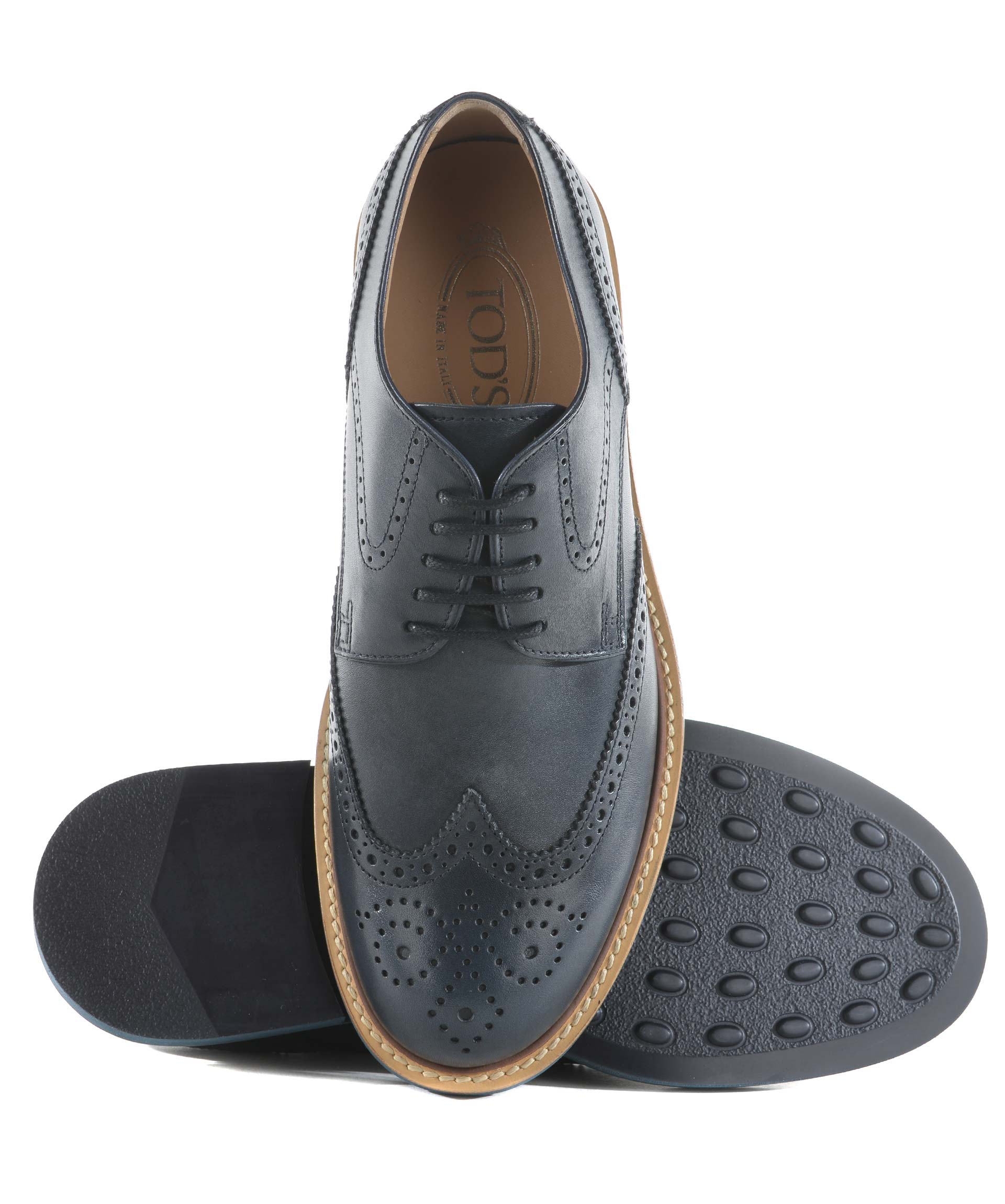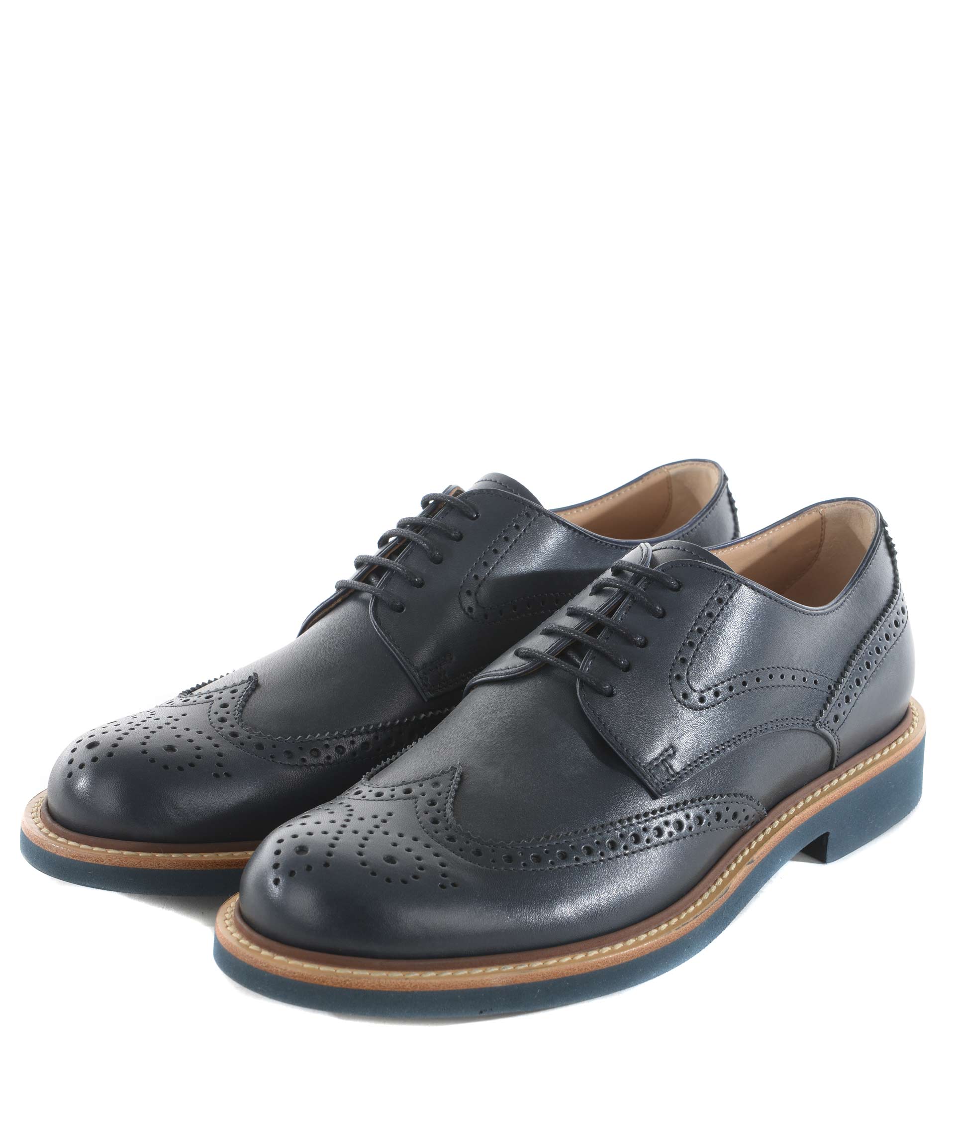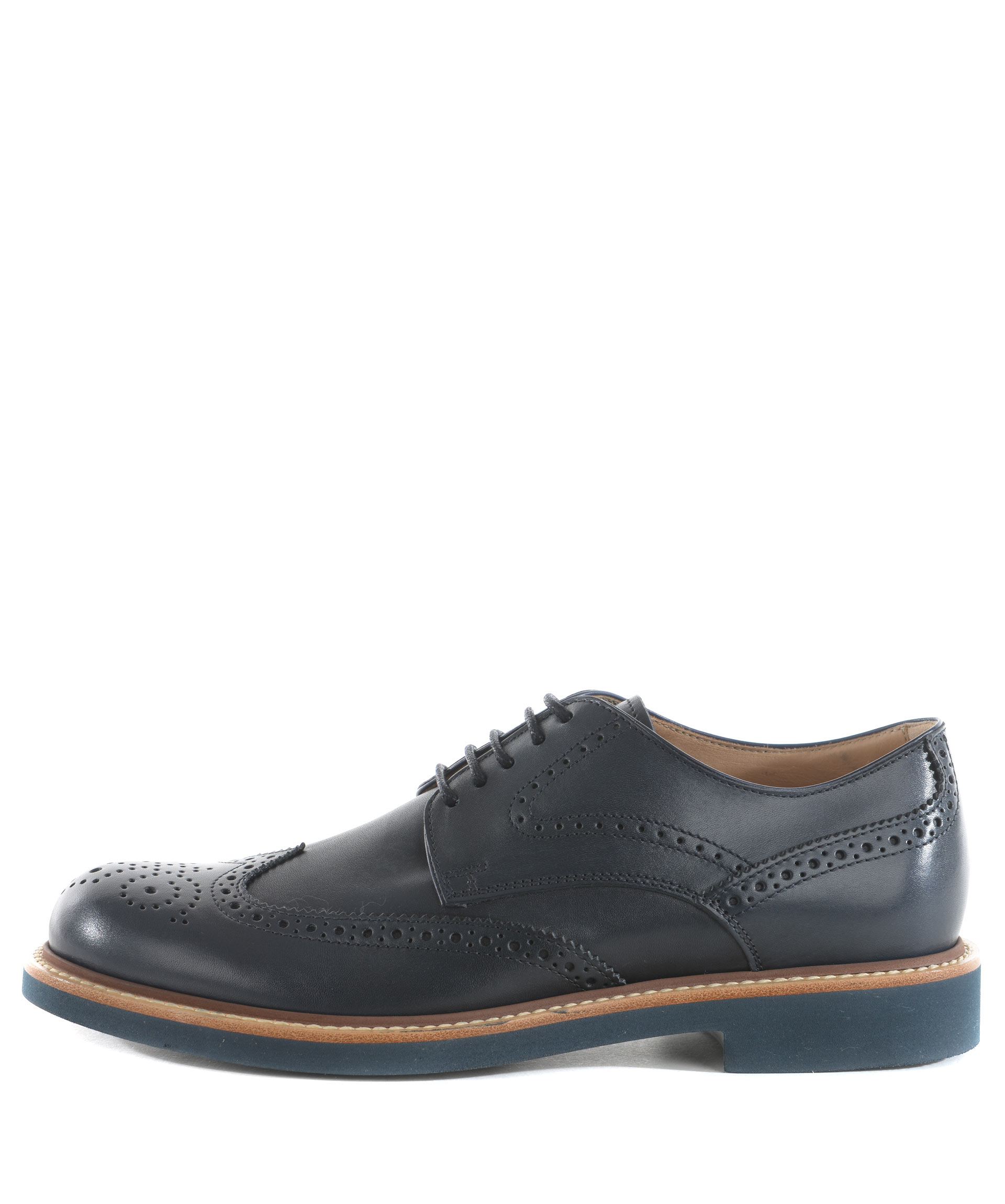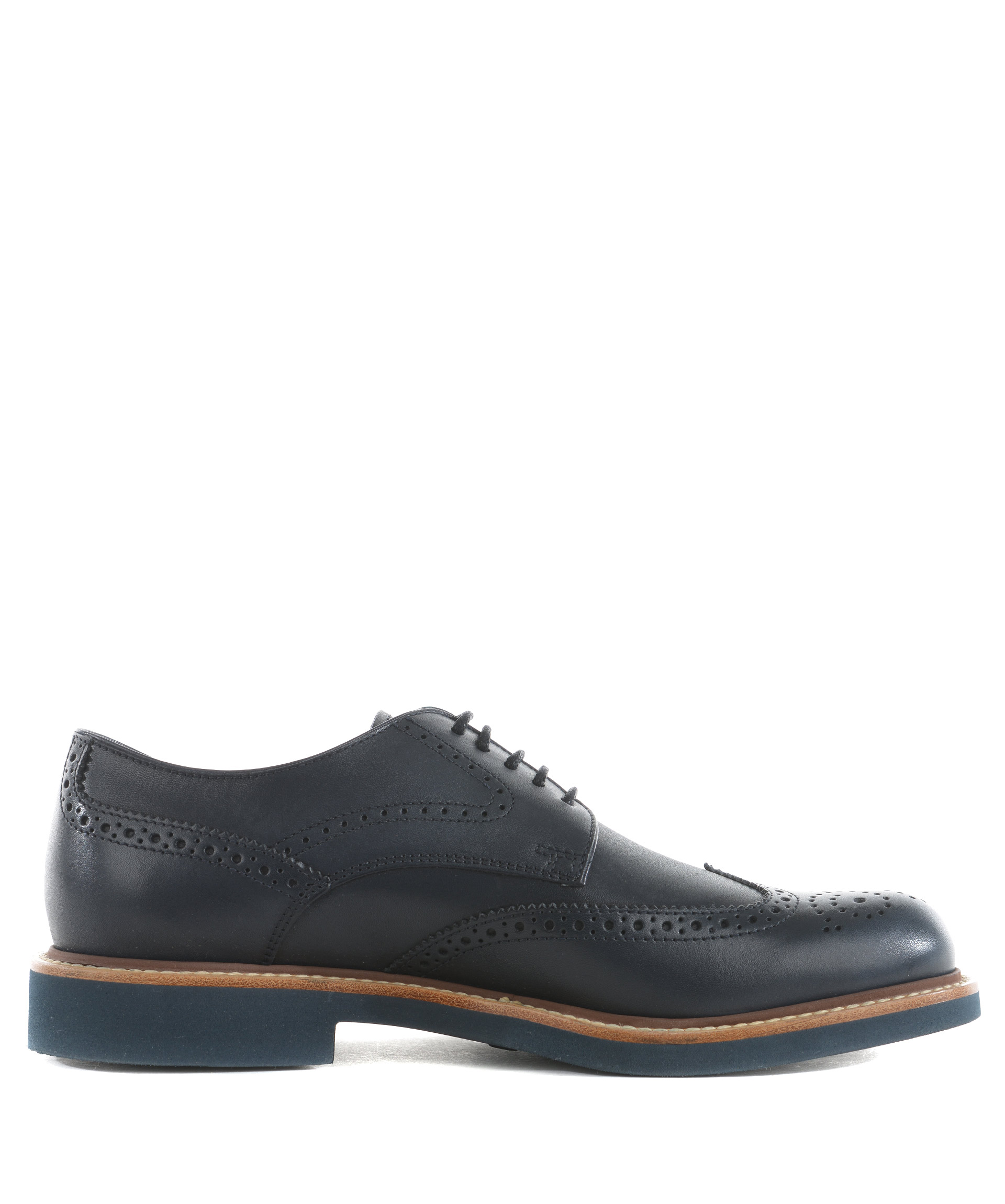 Scarpa derby Tod's in pelle Blu. Bucature all'inglese a coda di rondine e fiore sulla punta. Stringhe cerate. Guardolo in cuoio. Suola 25 mm in gomma leggera. Misura in foto 6