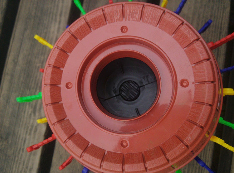 4.一手按着桶边,另一只手把短剑刺向桶上的插孔里,究竟是哪个孔能让海盗人弹出来?仔细考虑再把短剑刺进去(每摸动把海盗人弹出来的那根轴的边缘,能使他弹出桶外的孔就改变一次);
