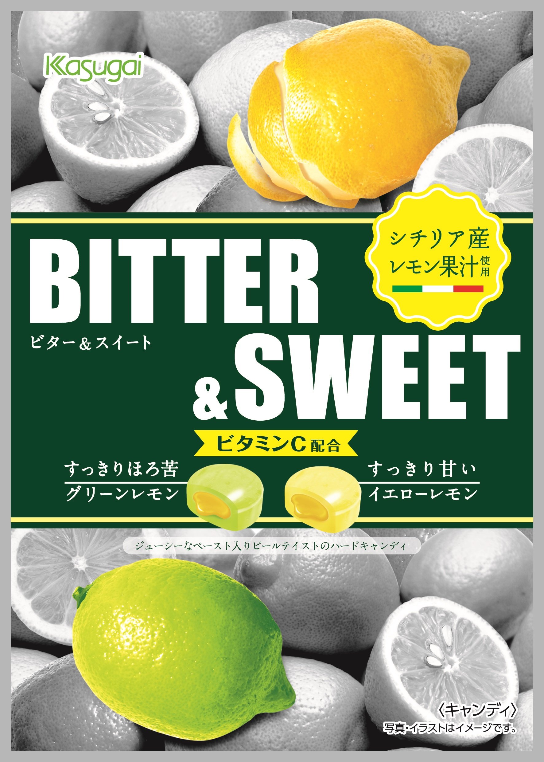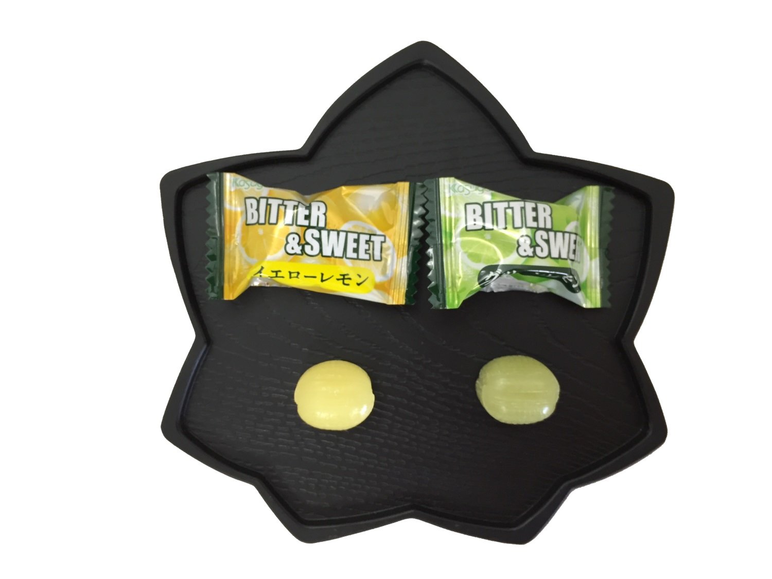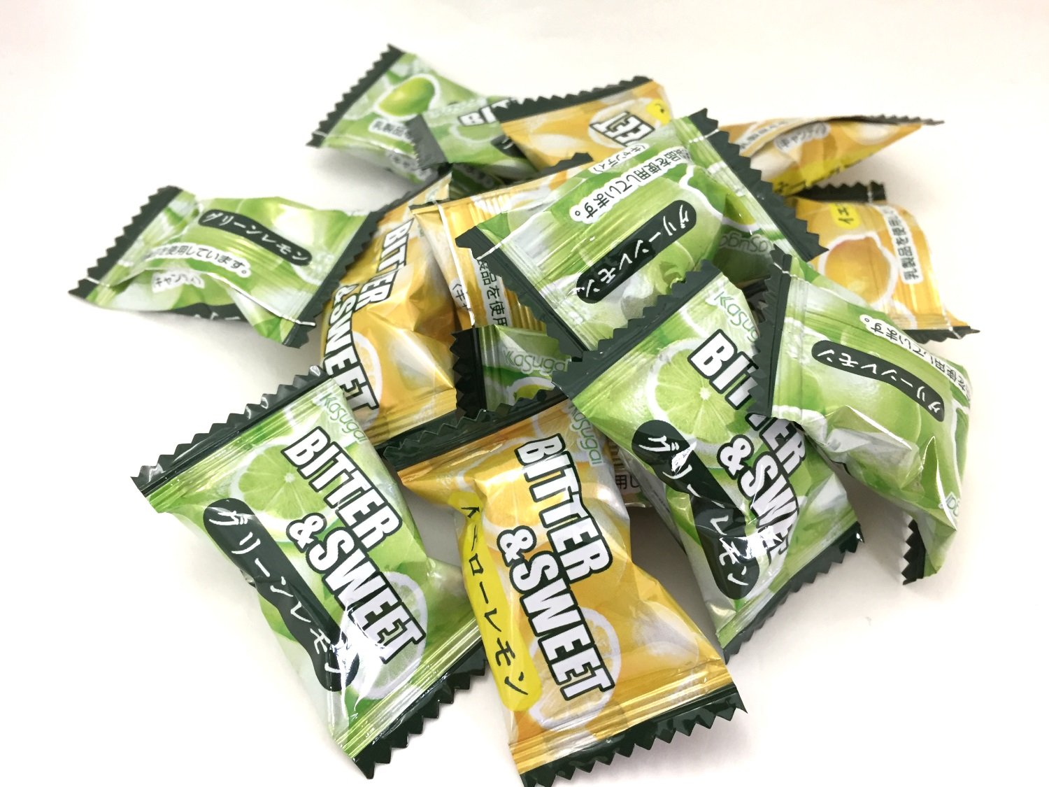 Two types of assorted candy with a juicy lemon flavor paste reminiscent of fruit juice, a refreshing bitter green lemon taste and a refreshing sweet yellow lemon flavor.