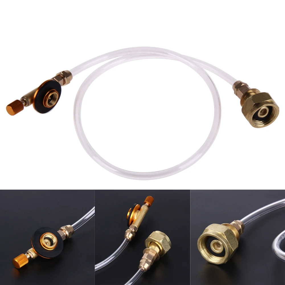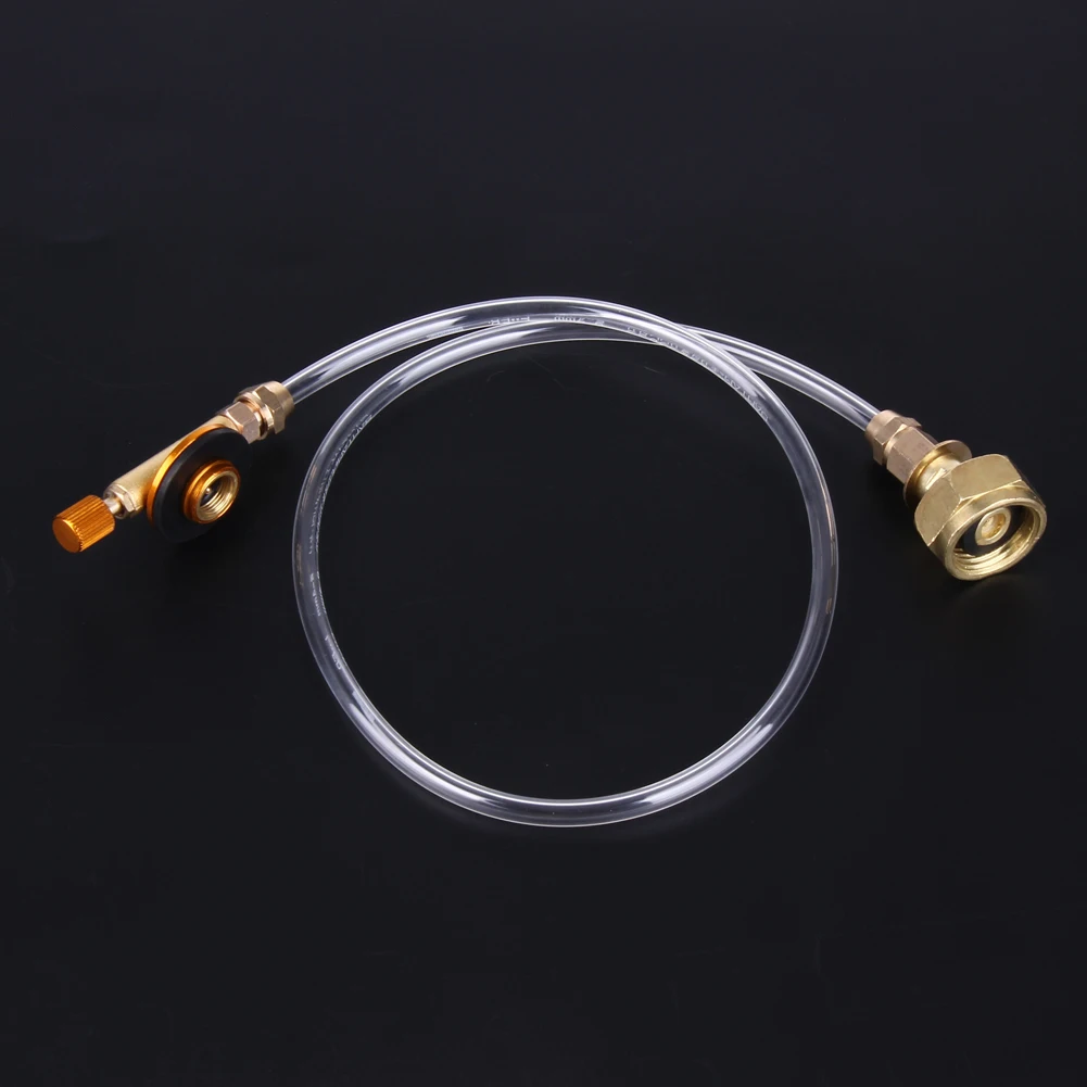 Outdoor Gas Stove Camping Stove Propane Refill Adapter Burner LPG Flat Cylinder tank Coupler Bottle Adapter Save Features: Used to fill your flat tank from liquefied gas cylinder. Pipeline is made of high pressure PU pipe. Safe and easy to control. Usage: 1. You need a inflatable valve, a empty flat tank, a liquefied gas cylinder, and a electronic scale. 2. Please make sure that flat tank connection valve is closed before gas charging. 3. Connect the liquefied gas cylinder interface to the cylinder, unscrew the cylinder valve and check whether there is gas escaping. 4. Let the liquefied gas cylinder lie down or upside down, and connect to flat tank. Put the connected flat tank on the scale, open the liquefied gas cylinder knob, then you can see liquefied gas flow in the pipe. 5. After gas charging, please shut all the valves. Notes: Please operate in ventilated open space. Do NOT operate under any circumstances with flame. Be sure flat tank ≤ 340g. Specifications: Material: Metal+PU Item length: 60cm / 23.6in Item weight: 111g / 4.37oz 1xPropane Refill Adapter
