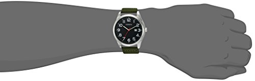 -. Feature : Silver-tone textured bezel; mineral crystal lens; matte black dial with calendar window; silver-tone hands and white Arabic numerals; P.R.Inted outer minute track / Olive green nylon strap with buckle closure / Japanese-quartz Movement / Case Diameter: 44.5mm / Not water resistant
