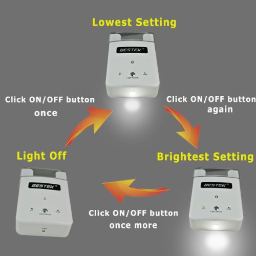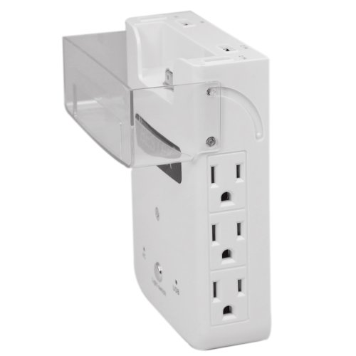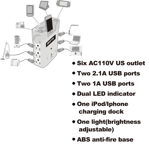 - Feature : This is the new upgraded version! Bestek logo has no blue light glowing now, and full surge protection for AC outlets added! / Six AC outlets : Six 110V AC outlets, plug in a variety of traditional-plug devices. Feel free to power up your laptop, coffee cooker and more . / Features four USB ports (two of which have an output of 2.1A, one remaining for 1A and the other is universal USB port). The four USB charging ports with over-load and short-circuit protections, allow you to safely charge cell phones, tablets, and other digital devices such as camcorders, digital cameras, DVD, etc. / The power of peace of mind: ABS anti-fire base material; built-in fuse; over-load / short circuit / surge protection. 12 month warranty / Integrated LED nightlight with two brightness levels; LED power indicators for USB and AC output. Conveniently and securely charge your iPod or iPhone via the charging dock with protective security shield