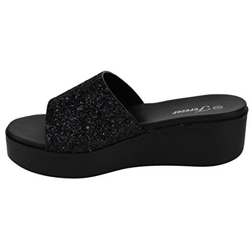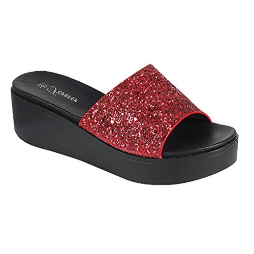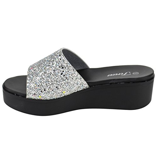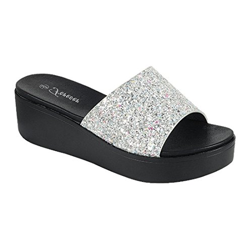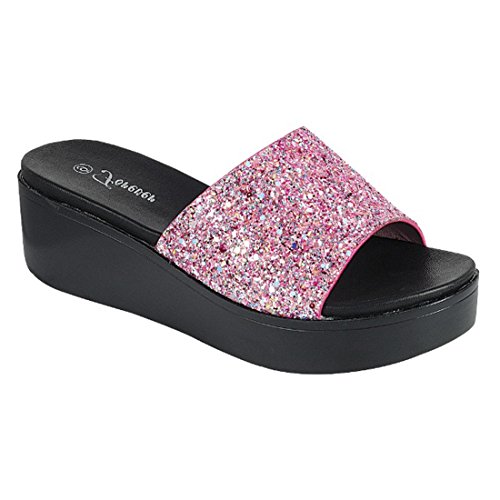 Product Description From denim to dresses, this wedge sandal will keep your look fresh and chic! Featuring glitter upper, wide band and slip on style, wedge heel with platform. The fashion-forward shoe keeps you looking stylish and feeling cozy! 0