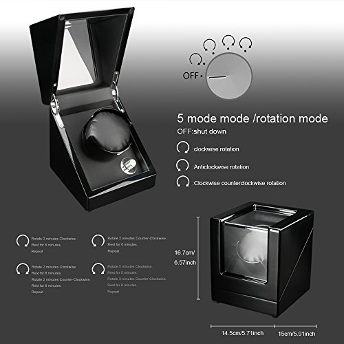 -. Feature : Solid Construction: Hand polished for high gloss finish,Fine PU Interior materail,Ultra-quiet motor,Advanced non-fading accessories. / Four Winding Modes:1.rotate clockwise for 2 min, pause 6 min,repeat. 2.counter-clockwise 2 min,pause 6 min,repeat. 3.rotate clockwise for 2 min, pause 6 min,counter-clockwise 2 min,pause 6 min,repeat. 4.rotate clockwise for 5 min,then counter-clockwise 5 min,pause 6 min,repeat.Excellent working keeps the accuracy of the TPD(turn per day) and Rotating position. / Runs on batteries (not included) or with the included universal AC adapter / Program Settings:Mode 1 (650/TPD),Mode 2 (750/TPD),Mode 3 (850/TPD) / ApproP.R.Iate Size fits Big Watches,ideal gift to your friends or families.