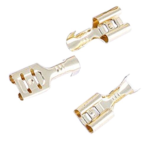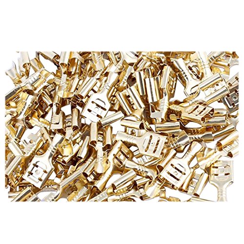 -. Feature : Product Name : Female Spade Terminal Connector;Material : Brass / Fit Stud Width : 6.3mm;Total Size : 18 x 7.5 x 4mm (L*W*H) / Fit Cable Diameter : 2.5mm;Main Color : Gold Tone / Weight : 30g / Package Content : 100(+-2%) x Female Spade Terminal Connector