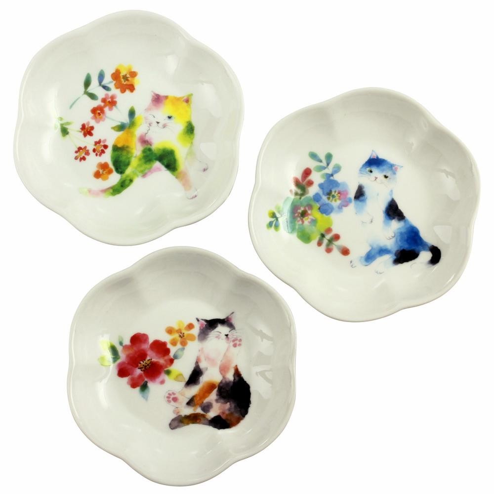 水彩画のようなタッチで花と猫を描いた小皿のセット。大切な方へのギフトにも最適です。