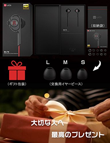 パッケージ内容物完備しております。柔らかいゴム製のイヤーピースをL/M/Sの3サイズを用意しました。耳のサイズにあわせて替えられます。ケーブルクリップ&収納袋付き、手軽くイヤフォンを収納できます。ギフトやお誕生日プレゼントにもぴったりです!