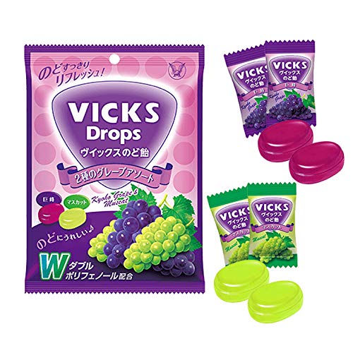 原材料:<巨峰味> 砂糖,水飴,濃縮ぶどう果汁,濃縮巨峰果汁,ペパーミントエキス粉末,酸味料,香料,甘味料(アスパルテーム・L-フェニルアラニン化合物),アントシアニン色素,チャ抽出物,クチナシ色素 <マスカット味> 砂糖,水飴,濃縮マスカット果汁,ペパーミントエキス粉末,酸味料,香料,甘味料(アスパルテーム・L-フェニルアラニン化合物),紅麹色素,チャ抽出物,クチナシ色素,クチナシ色素