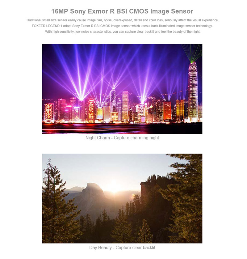 FOXEER LEGEND 1 is an extraordinary action camera. Armed with professional Ambarella A7LS processor and 16MP SONY Exmor R BSI CMOS image sensor, it brings high quality image and video. Adopting 7G optical glass lens with 166 degree super wide angle can accommodate more stunning scenery. LEGEND 1 performs excellent even in low light condition, 1 to 60 seconds time lapse let you enjoy rolling on with full force, sunrise and sunset during your journey. Featured by exclusive UAV remote wireless control photograph technology, you can wireless activate the photo/video by remote controller. It captures the captivating footage of every adventure you don't want to miss.