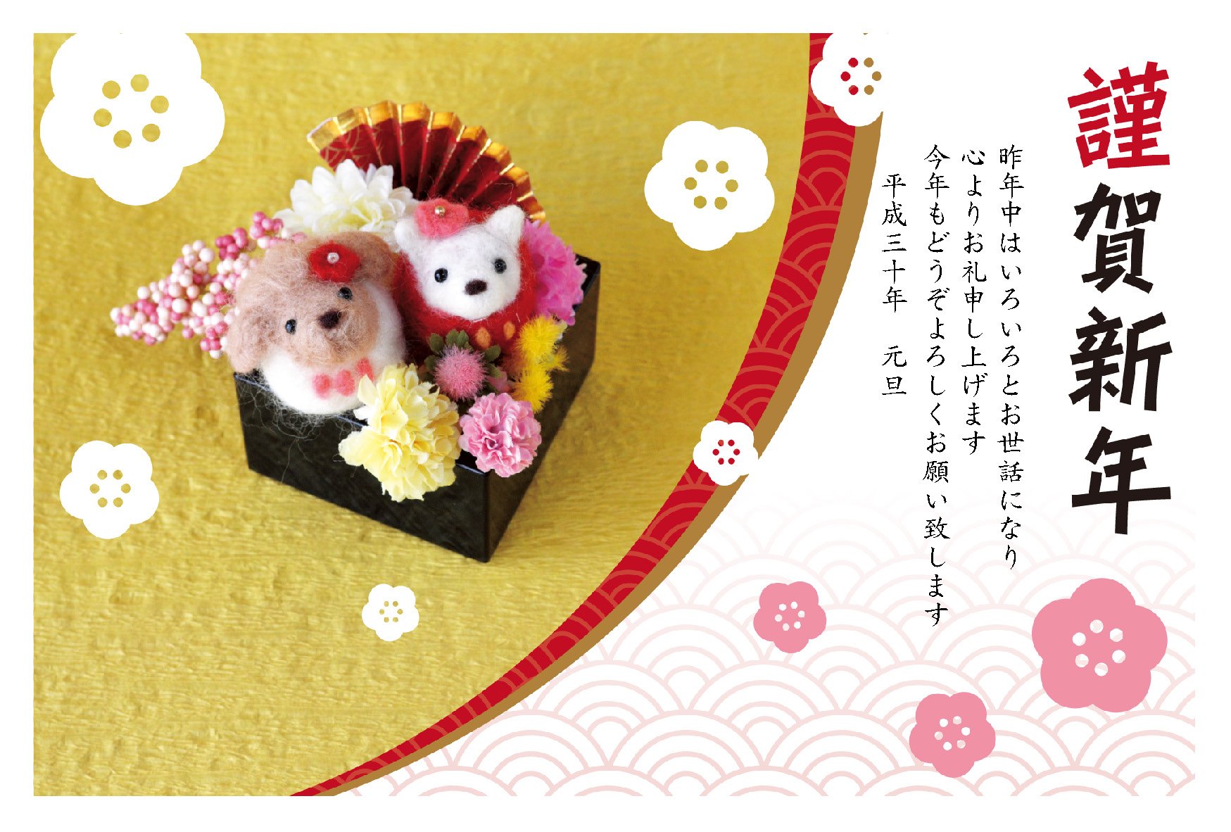 Cute dogs and crafts of flowers are in the box, and New Year's cards with a fun atmosphere like osechi.