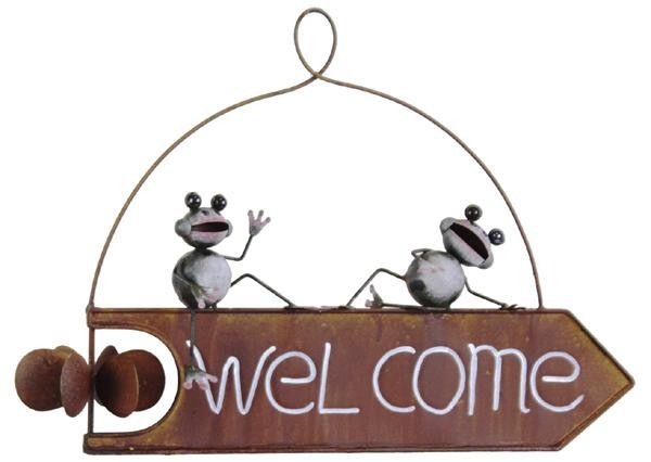 ブリキ製のウォールハンギングです。かわいいカエルたちが出迎えてくれます。 |