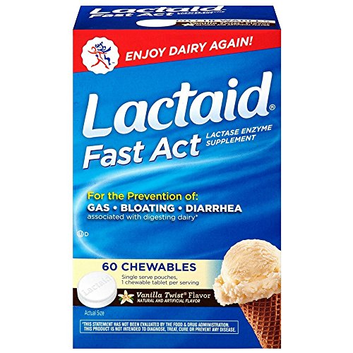 Studio : Groceries To Your Door Publisher : Groceries To Your Door Binding : Health and Beauty Product Description LACTAID® Fast Act Chewables start working when you take them with your first bite or sip of dairy food, helping prevent the gas, bloating, and diarrhea that many people experience after eating foods containing dairy. With the natural lactase enzyme, this dietary supplement helps prevent symptoms associated with lactose intolerance by breaking down milk sugar (lactose), so dairy foods are easier to digest. These tasty chewables start working with your first bite of dairy. Certified kosher, LACTAID® Fast Act Chewables have a smooth Vanilla TWIST® Flavor. This package comes with 60 single-dose pouches. 0