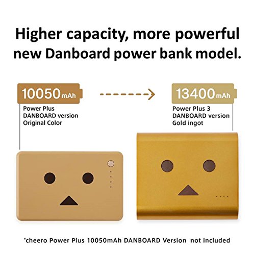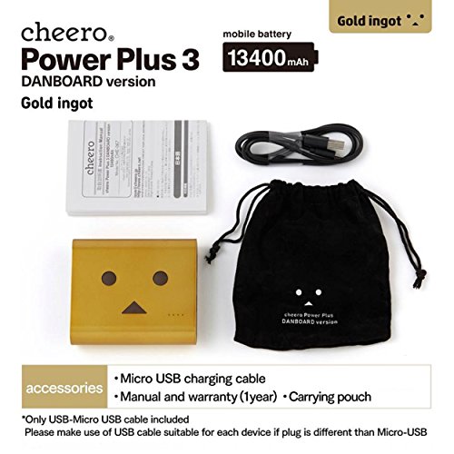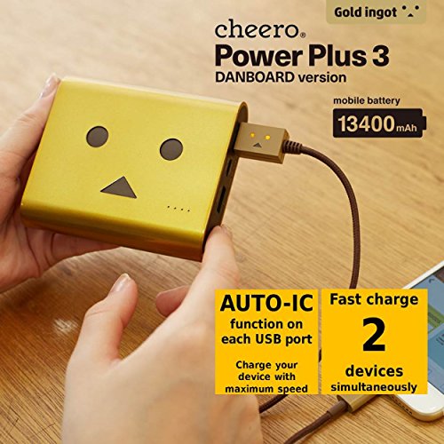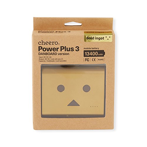 -. Feature : Announcing a new high-quality battery model based on the popular "Danboard" character, with a record-breaking capacity of 13400 mAh. This battery is a collaboration with this lovable character, upgrading the longtime best-seller "Power Plus 3". / In addition to the original light brown, we've added 3 stylish colors: shiny supercar red, sparkling gold, and snowman white (with a cute red nose), for a total of 4 colors. An original pouch in the same color as the battery is included. / Cheero products are made specially with quality and safety in mind. Because it is built using a Japan-made Panasonic cell, you can use this product without needless worry. To show that we have confidence in the quality of this product, a 1 year warranty is included. / This battery contains an AUTO-IC which automatically recognizes the attached device, and provides the optimum amount of current. As the input is 2A, charging is very quick. There are two output ports with a combined total of 3.4A for fast charging of other devices. / Special protection circuity on each battery provides even more safety. In addition, fire resistant materials are employed, so in the unlikely event of a problem the chance of damage will be reduced.