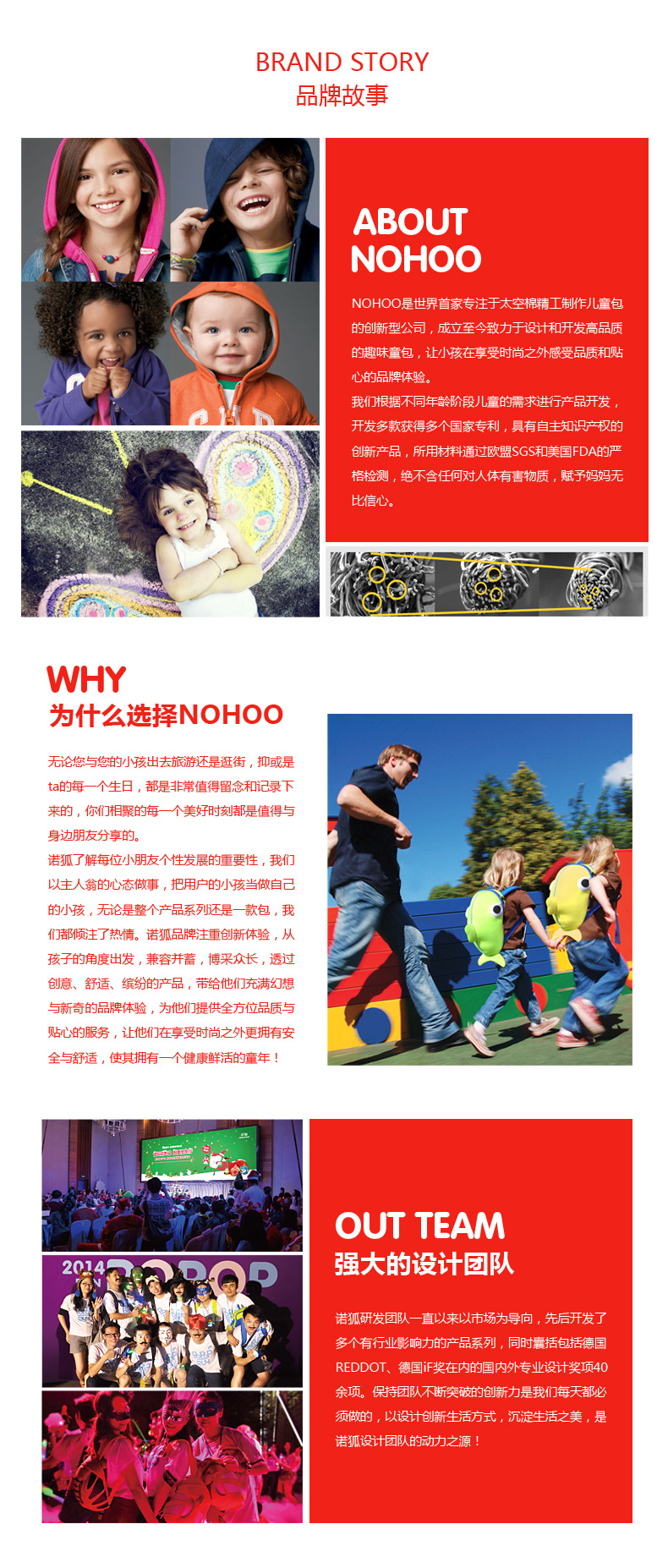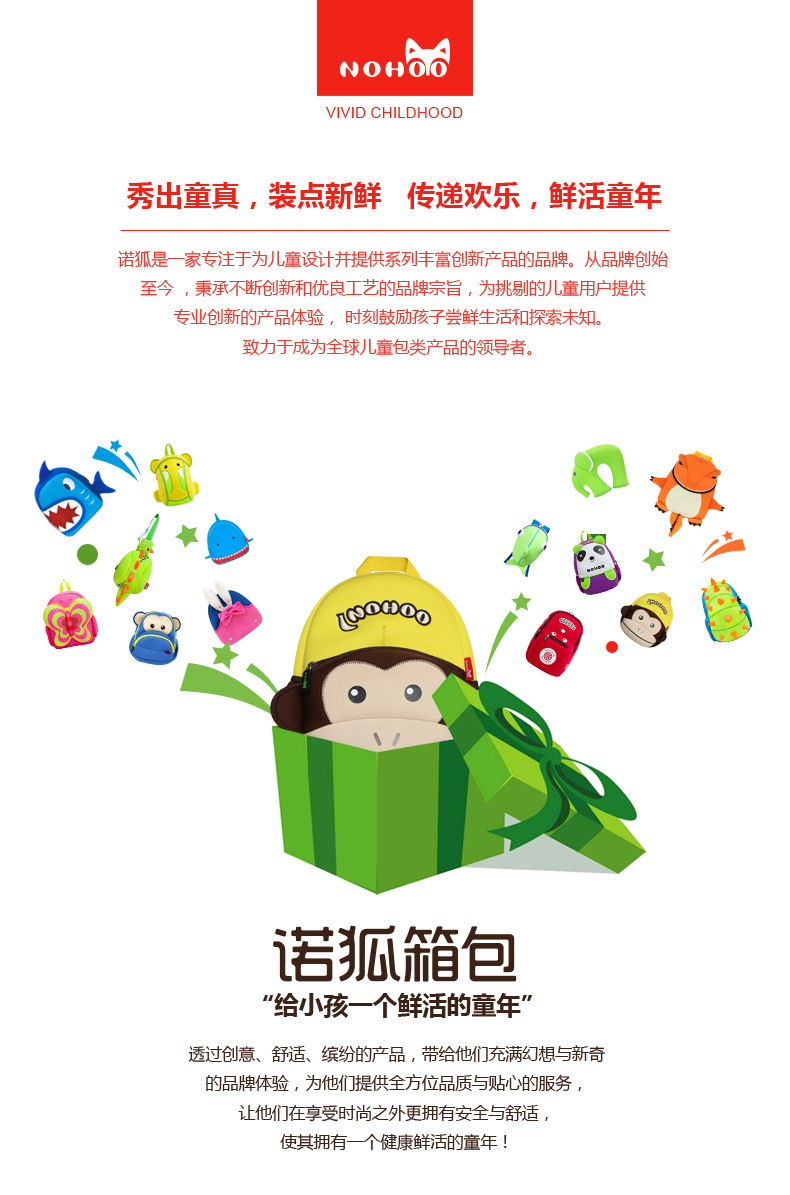 诺狐采用独特的Neoprene潜水料,有别于一般材质,潜水料具有良好的柔软性与弹性,防水防潮,质地轻盈等特点,有适用于专业潜水衣及各种运动领域,其立体塑形极具个性的特性更风靡时尚圈。诺狐童包独特的设计与良好的材质有别于一般的儿童包,立体结构剪裁,鲜艳大胆的配色,打材料的特性发挥到淋漓尽致,为我们的用户提供缤纷、舒适、健康的产品体验。