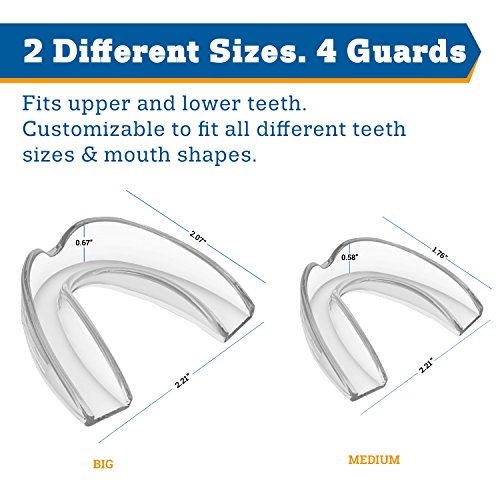 The set contains 4 BPA-free mouth guards, 2 of each large and medium sizes. Comes with an anti-bacterial case.