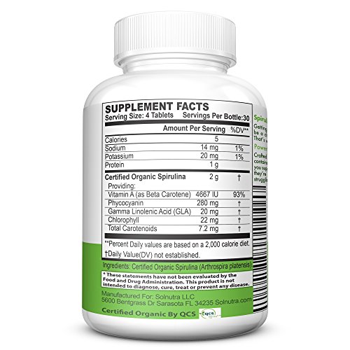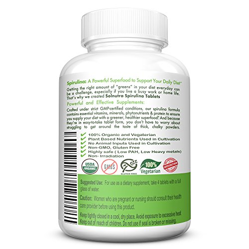-. Feature : Advanced Superfood Blend - Cultured using filtered groundwater from artesian wells, our nutrient-dense source of phytonutrients, amino acids, vitamins and minerals, our spirulina tablets provide safe, effective support. / Quick Tablet Form - Better than spirulina powder with an acquired taste, our tablets go down easily with water and reach deep into your gut for more efficient results. / Pure, Natural Support - A complete protein with 9 essential amino acids and 10x the amount of beta carotene of carrots, Solnutra is packed with natural, organic ingredients such as Vitamin A, Gamma Linolenic Acid, and Chlorophyll. / Vegan-Friendly - Boasting four unique organic certifications, our safe, healthy supplement is vegan friendly, cruelty free, Kosher, and Halal, making it a universal source of nitrogen and phosphorous nutrients for all. / Satisfaction Guaranteed - Every Solnutra supplement is certified to GMP specifications, ISO 220000 certified, and backed by true quality assurance.