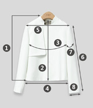 | 尺码 | ①前衣长 | ②后中长 | ③胸围 | ④下摆围 | ⑤肩宽 | ⑥袖长 | ⑦袖臂围 | ⑧袖口围 | ||