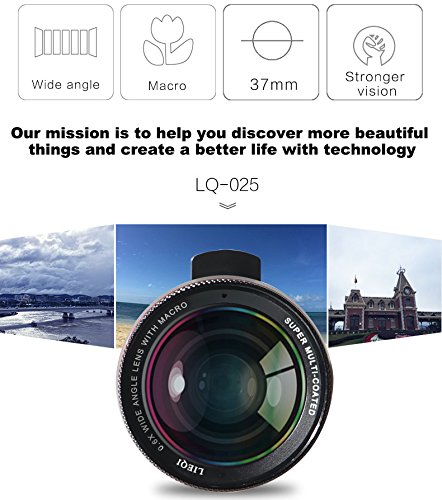 ? - Professional Grade HD Optical Glass helps minimize lens glare, reflection, ghosting and other artifacts for superb clarity. ? - .6X super wide angle lens for a high definition wide angle image without distortion. ? - 12.5X enhanced macro lens for extreme close-up shots and enhanced detail. ? - Universal clip can attach any 37mm thread Digital SLR Pro Lens on your mobile. ? - Easy to Assemble and Use: The wide angle lens and macro lens screw together/apart smoothly with a precision fit.