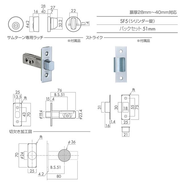 ●適用扉厚:28~40mm バックセット:51mm 付属シリンダーキー:3本