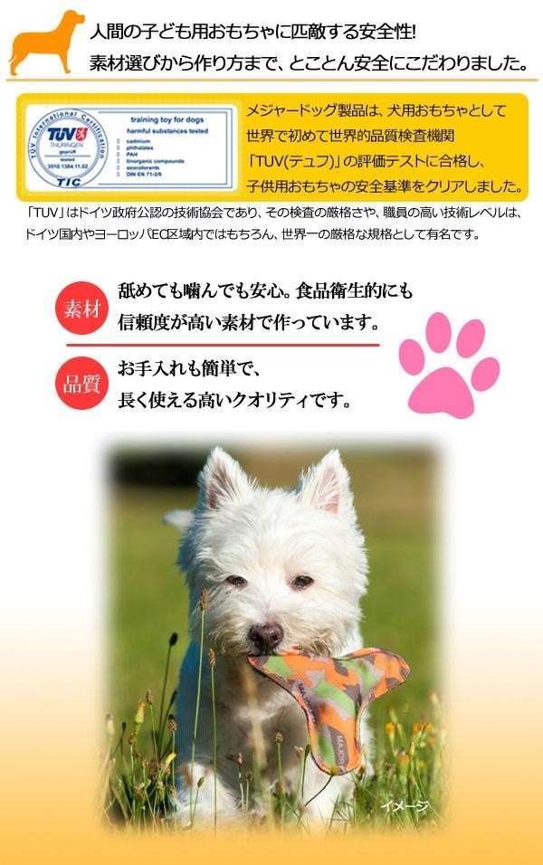 | 素材は耐久性が高く、ワンちゃんが噛んでも安心・安全なものを使用しています。ワンちゃんが長く楽しめるよう様々な工夫がなされているおもちゃです♪そのクオリティの高さは、ドッグトレーナーも愛用している程です! |