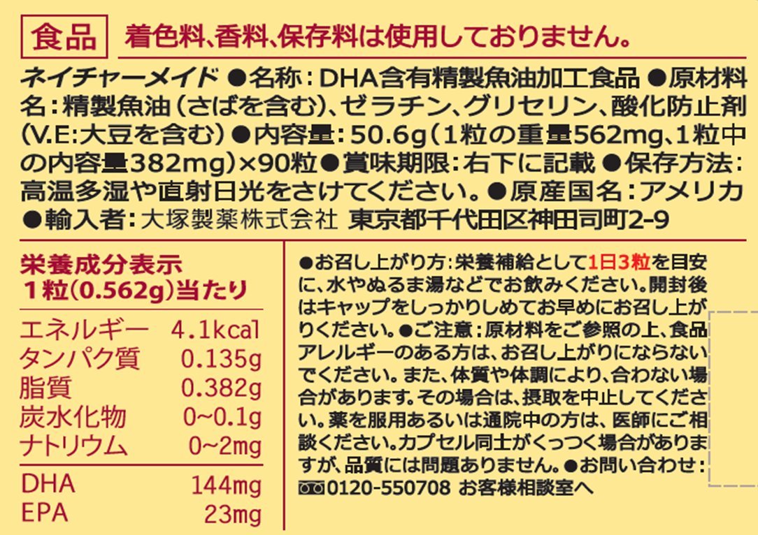 「ネイチャーメイド DHA 90粒」は、もっと元気でアクティブな毎日を応援する栄養補助食品。DHA(ドコサヘキサエン酸・魚の油に含まれる不飽和脂肪酸の一種)は、健康に大切な成分といわれていますが、人の体内で生産することができない必須脂肪酸なので魚の油などからしっかり摂る必要があります。DHAを1粒144mg含有。香料・着色料・防腐剤を無添加。
