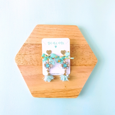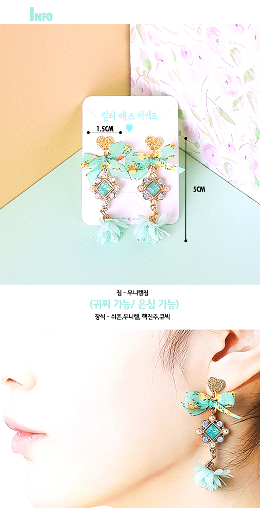 <민트 칵테일 꽃>귀걸이는 알러지방지 처리된 무니켈침으로 제작한 하트&드롭 귀걸이입니다.