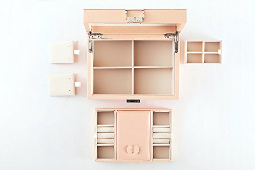INCLUDES: The lid contains a large mirror while the upper level has 4 ring holder slots, 4 small compartments and one large closing compartment in the middle. Lift the upper level to uncover a secret space with up to 7 more storage spaces offering space to store your rings, earrings, chain necklaces, small watches, thin bracelets and cuffs.