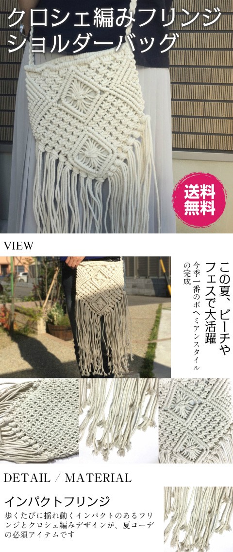 この夏、ビーチやフェスで大活躍今季一番のボヘミアンスタイルの完成インパクトフリンジ歩くたびに揺れ動くインパクトのあるフリンジとクロシェ編みデザインが、夏コーデの必須アイテムです斜めがけのかわいい小さめサイズメインファスナー開閉式、内側はオープンポケット付き。ちょっとそこまでのお出かけにもぴったりなサイズです。