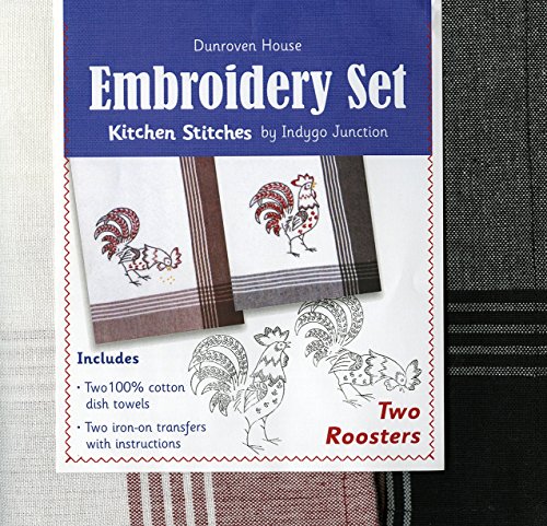 Dunroven House Two Roosters Kitchen Stitches Embroidery Set, White with Red Stripes