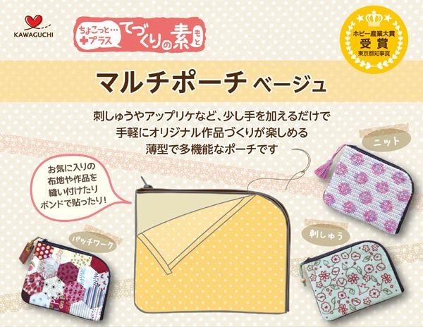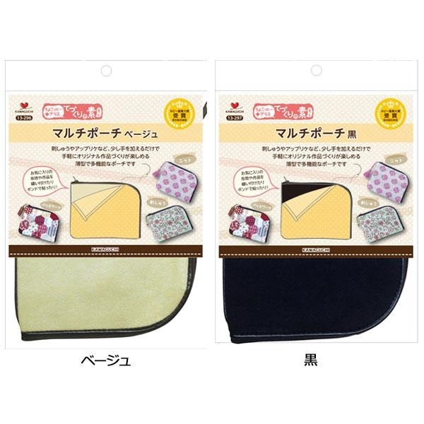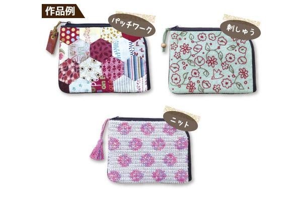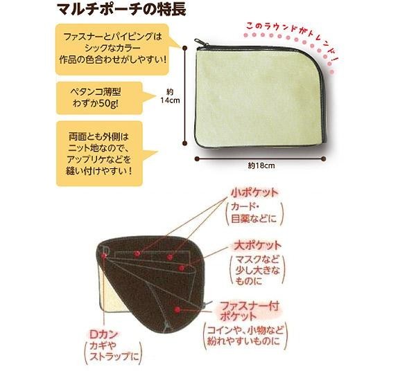 刺しゅうやアップリケなど、少し手を加えるだけで手軽にオリジナル作品づくりが楽しめるマルチポーチです。大小4つのポケット付きです。内側にはDカン付で鍵などをつけるのにも便利です。オリジナル作品の作り方はとても簡単!本体の大きさに1.5~2cm程度の縫い代を付けて、刺しゅうやパッチワークなどの作品を作り、縫い付けるだけ!縫い代を折りこみながら、まつります。 |