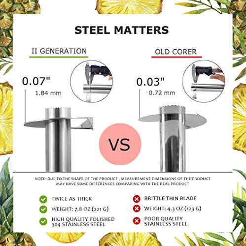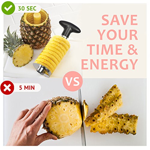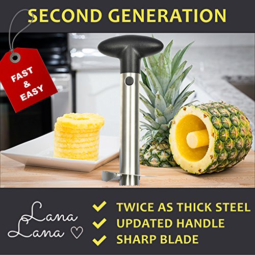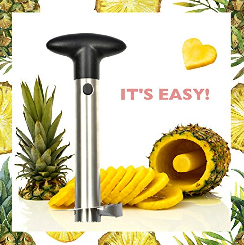 Studio : LANA LANA Publisher : LANA LANA Product Description PINEAPPLE SLICER that is made of stainless steel can peel, core and slice in seconds. FEATURE: Pineapple slicer will peel, core, and slice a fresh pineapple in 30 seconds. Removes perfectly formed rings while leaving the core in the shell. Perfect For Anyone! This simple yet beautiful design makes it easy for anyone to just grip, turn, and slice! Perfect slices every time. Super Easy Clean-up! Knob and slicer separate with the press of a button for easy cleaning. Sharp, medium-sized, stainless steel blade is shaped for compact storage HOW TO USE IT: 1. Cut the pineapple's head 2. Turn the pineapple corer down clockwise 3. Hold the pineapple and remove the flesh 4. Press the button on the handle and remove it 5. Take out the flesh 6. Enjoy your pineapple! INCLUDE: 1×Pineapple Corer Slicer 0