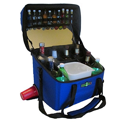 -. Feature : Holds 8 Bottles Up to 2 Liters in Size - About the size of a conventional cooler, the 18" long x 14" wide x 17" high Mega Cocktail Gator is compact enough to stow away, yet has plenty of room to fit all your favorite liquors, wine, and mixers. Stepped bottle dividers recreate a back bar effect with added padding to keep the bottles from clanging together on the go. / Fits a 10 lb Bag of Ice - The cooler includes an 8 quart heavy duty polyethylene tub with a snap tight lid. The best drinks start with fresh clean ice, never settle for contaminated beer cooler ice again. / Spring Loaded Large 18 oz Cup Dispenser - The Gator is equipped with zippered side pocket to dispense large plastic cups. The 18 inch cup storage tube has a foam spring designed to supply cups for the largest of parties. / Mirrored Lid with Top Shelf Bottle Holders - The opened lid reveals an acrylic mirror creating a bar room atmosphere in any location. Accented with elastic holders for 10 top shelf miniature bottles, even the most exotic of mixes are possible. / Top Storage Compartment and Large Side Pocket - The 4" x 4" x 18" zippered top storage compartment is large enough to fit shakers, strainers, lemons and limes. A great place to store utensils and ingredients for creating the most complicated concoctions. An Additional 8" x 9" x 2" side pocket is great for keeping stir sticks, straws, cards, dice, or anything you might need to accent the party.