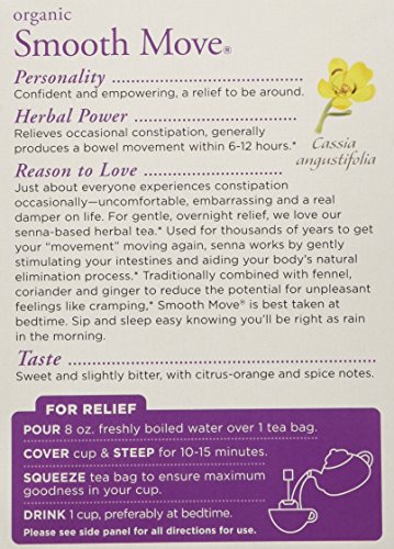 Just about everyone experiences constipation occasionally - uncomfortable, embarrassing and a real damper on life. For gentle, overnight relief, we love the senna-based herbal tea. Used for thousands of years to get your "movement" moving again, senna works by gently stimulating your intestines and aiding your body's natural elimination process. Traditionally combined with fennel, coriander and ginger to reduce the potential for unpleasant feelings like cramping, Smooth Move is best taken at bedtime. Sip and sleep easy knowing you'll be right as rain in the morning.Feature
