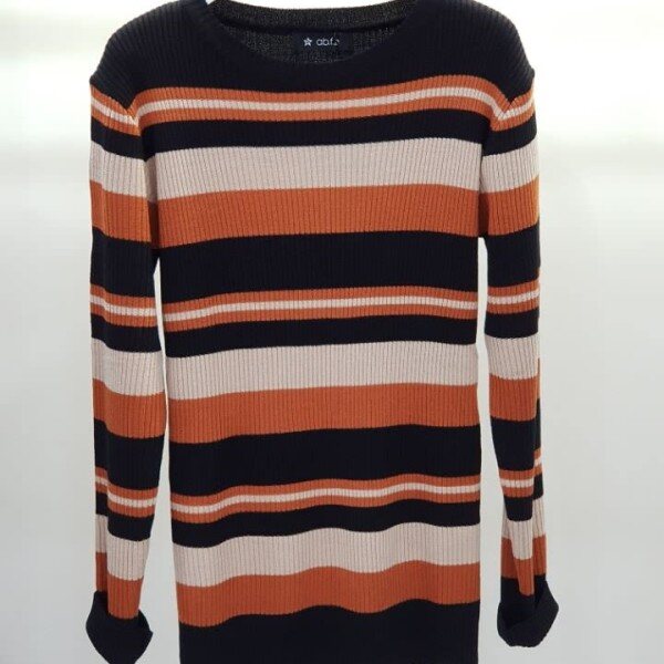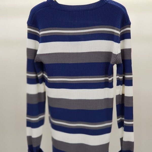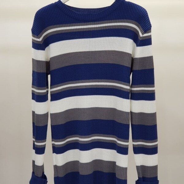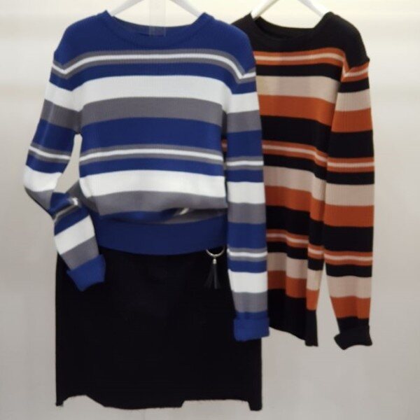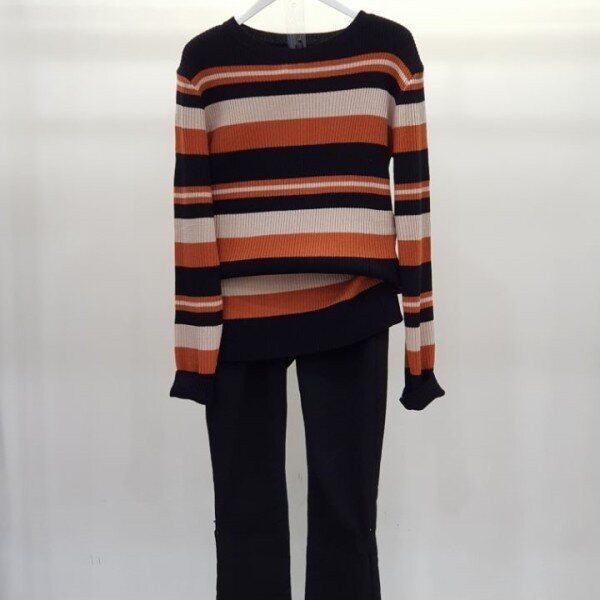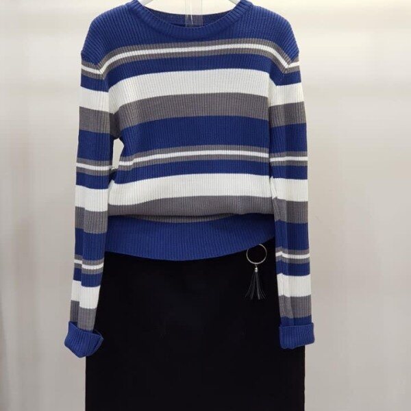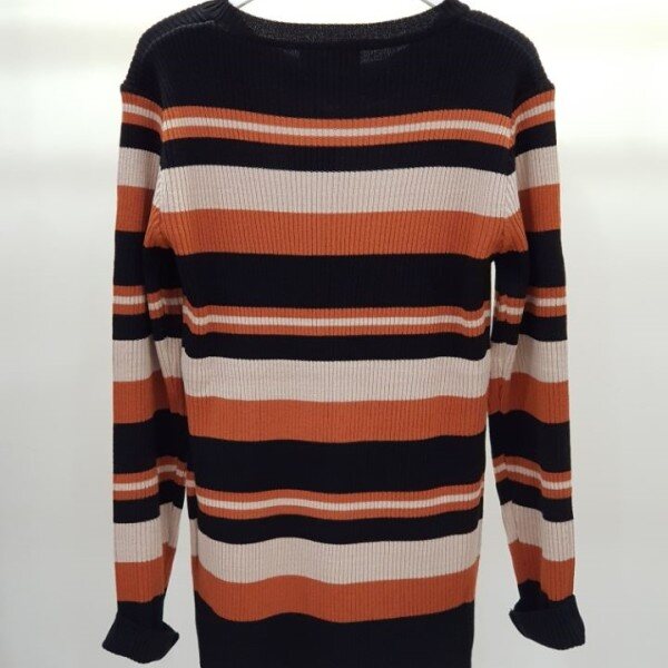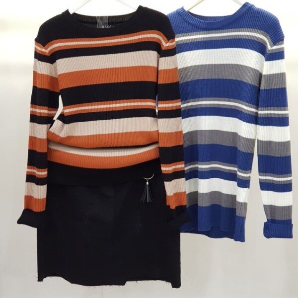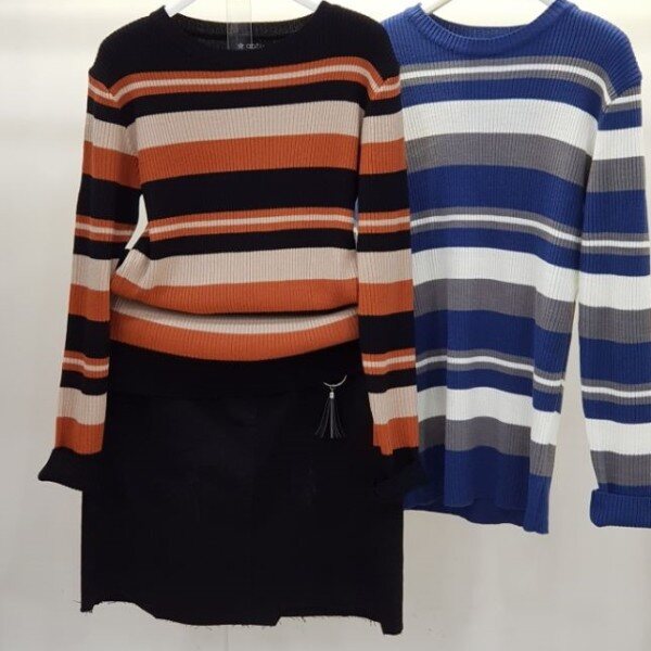 단가라 스타일의 배색 색감이 예쁜 니트입니다.골지 소재라 몸에 살짝 붙는 스타일로 청바지나 스커트에 입으시면 잘 어울리는 디자인이에요.