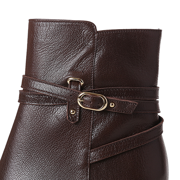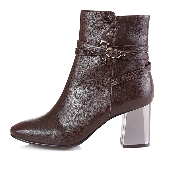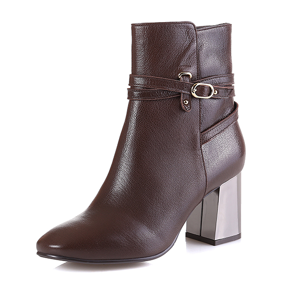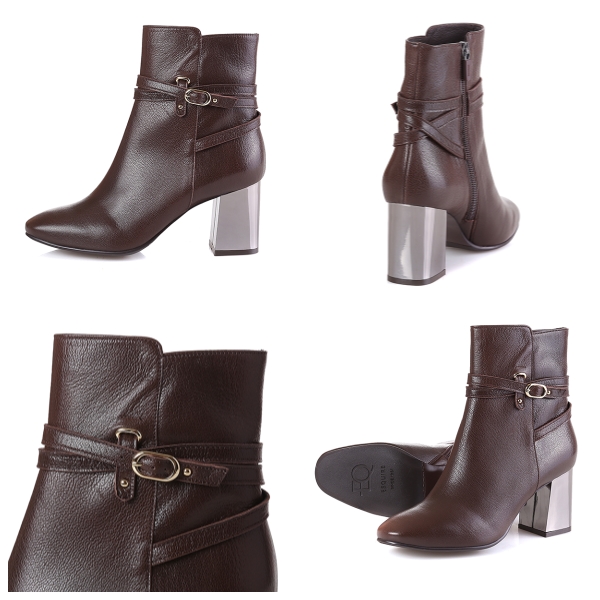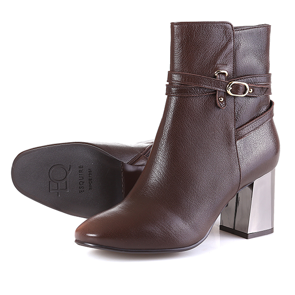 기본형의 앵클 부츠에 얇은 스트랩과 버클, 볼드한 메탈굽으로 포인트를 줌. 안쪽에 지퍼가 있어 착화가 용이하고, 무난한 스타일로 다양한 옷차림에 매칭하기 편한 아이템.