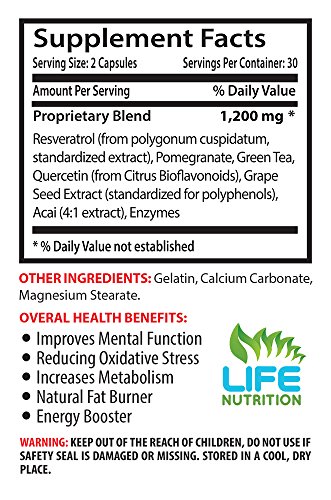 Studio : LIFE NUTRITION Publisher : LIFE NUTRITION Binding : Health and Beauty Product Description weight loss appetite suppressant - RESVERATROL - GRAPE SEED EXTRACT - COMBO - resveratrol aging supplements - 2 Bottles, (60 60 Capsules) Boosts Muscle Energy: Consumption of grape seed extract may be useful in helping to prove the molecular function, energy production and exercise ability. Grape seed extract activates the production of fatty acids in muscle. It may be beneficial in improvement of the metabolism. Improve skin condition: Resveratrol can slow down the growth of acne. It comes to resveratrol's anti-aging benefits, and the compound in resveratrol could help improve skin conditions. Resveratrol is known to contain coenzyme q 10, several vitamins and minerals and also alpha lipoic acid, where the role of the vitamins is to provide energy necessary in the elimination of wrinkles and other aberrations. Healthy brain and cardiovascular function: Resveratrol has a strong ability at optimizing the health of the nitric oxide cycle. Nitric oxide is involved in the nervous, immune and vascular systems. Healthy brain and cardiovascular function depends upon a greater nitric oxide activity. Promotes Thick Hair: Consumption of red wine extract is believed to improve circulation, ensuring adequate blood circulation to the scalp. This can reduce hair loss. Resveratrol is also believed to improve hair strength and the formation of cells on your scalp, thereby promoting hair growth and making it thicker. Control weight gain and obesity: Grape seed extract could improve your health and weight loss efforts. This extract is high in Vitamin E and has been found to reduce obesity. It may help to mitigate the formation of new fat cells, curtail weight gain by reducing obesity. 0