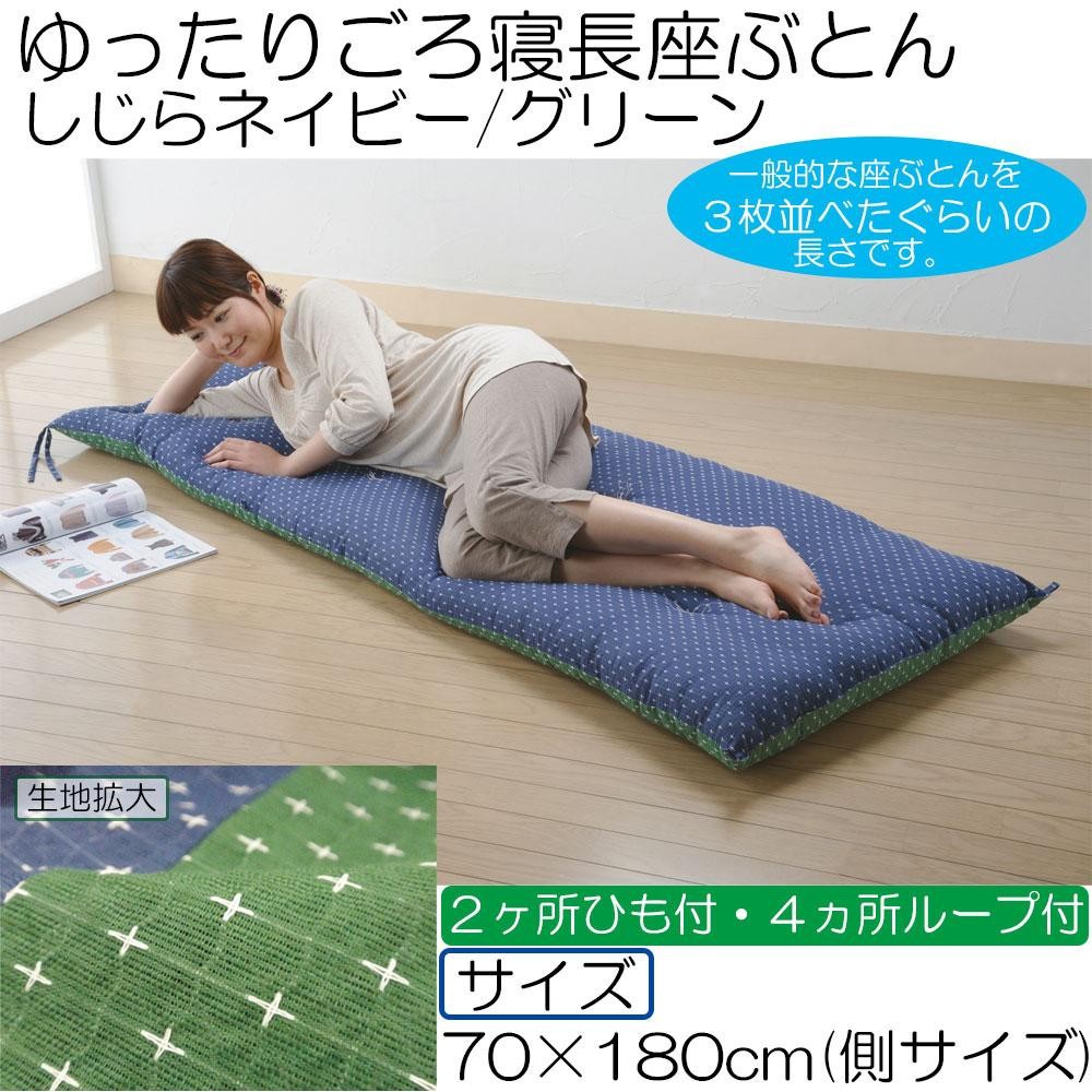 | ちょっと横になるのにちょうどいい、長~い座ぶとん。一般的な座ぶとんを3枚並べたぐらいの長さです。1枚1枚手づくりなので、わた切れしにくく、ふんわりとした仕上がりです。 |