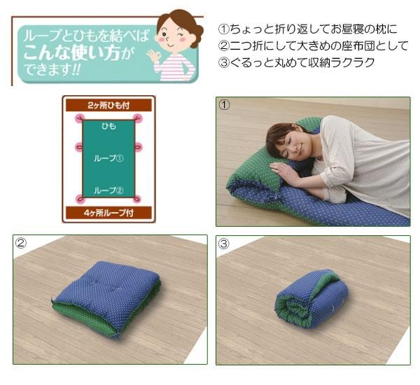 ちょっと横になるのにちょうどいい、長~い座ぶとん。一般的な座ぶとんを3枚並べたぐらいの長さです。1枚1枚手づくりなので、わた切れしにくく、ふんわりとした仕上がりです。 |