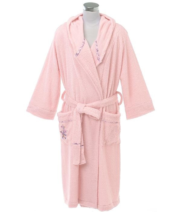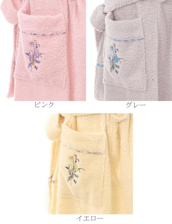 | 柔らかな肌ざわりでリラックスタイムにおすすめのバスローブ。右側のポケットに花の刺繍が施されています♪ピンク・グレー・イエローの3色からお選びください☆ |