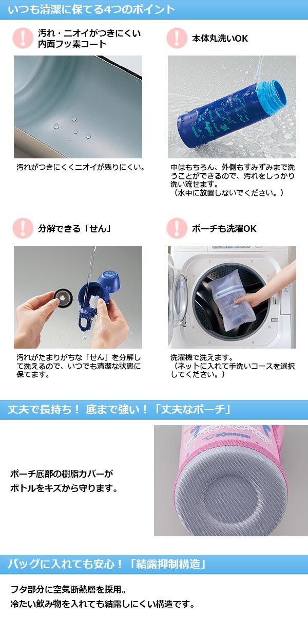 軽量・コンパクトで持ち運びラクラク!!結露しにくい構造で、朝入れたドリンクの温度を長時間キープします。本体丸洗いOKでポーチも洗濯できますので、清潔にお使いいただけます。ポーチには、反射材やネームプレートが付いています。 |