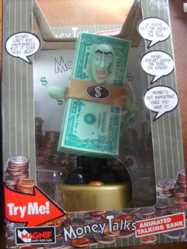 Studio : Magnif Publisher : Magnif Binding : Toy Product Description Have fun saving money with the Money Talks bank. Drop a coin into the slot or push the button and the Money Talks bank will activate a sound chip to emit uncanny little sayings about the way you save your money. Such sayings include "Money is not important once you have it!", "Money doesn't grow on trees...I've looked!", "If you've got the money...I've got the time!" and "Money can't buy happiness...but it sure helps!". The bank measures approximately 9-1/2"H x 4-1/4"L x 4-1/4"W. 0