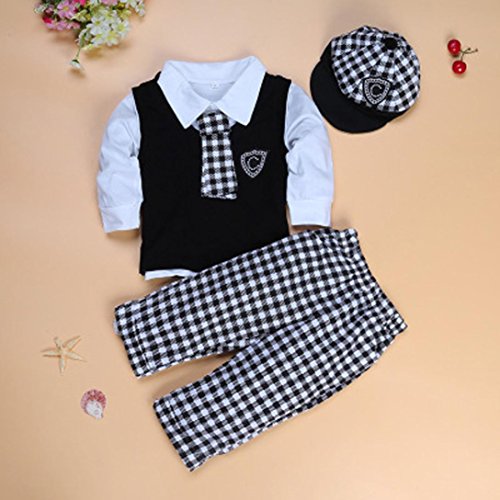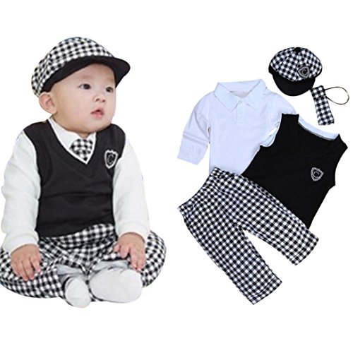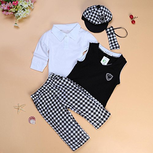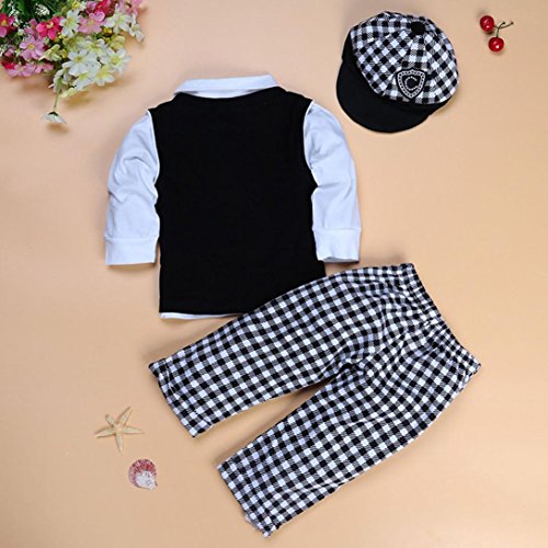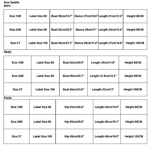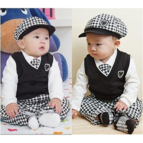Specifications: NOTE: Please compare the detail sizes with yours before you buy!!! Use similar clothing to compare with the size. Gender:Boys Clothing Length:Regular Pattern Type:Solid Sleeve Style:Regular Style:Occident Material:Cotton Blend Sleeve Length:Long Sleeve Package include:1PC Shirt 1PC Pants 1PC Vest 1PC Necktie 1PC Hat 0