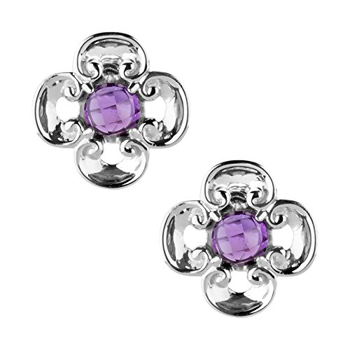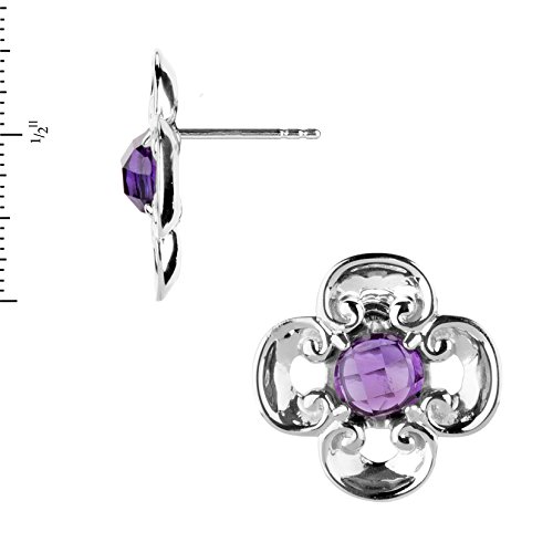 Sterling silver swirls create the petals of flowers that surround sparkling faceted purple amethysts. Large enough to make a statement, these earrings provide a touch of color as they add polish and delight to your every ensemble. Day after day, these earrings shine.Feature