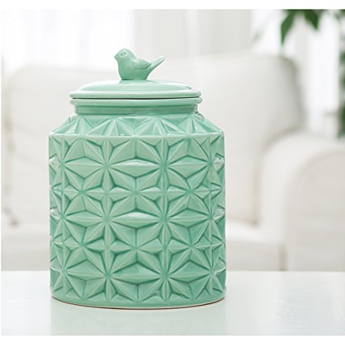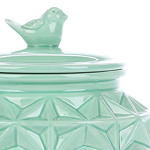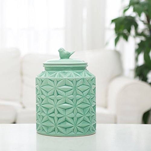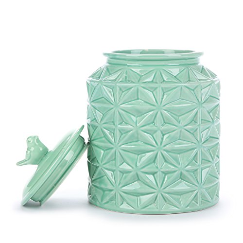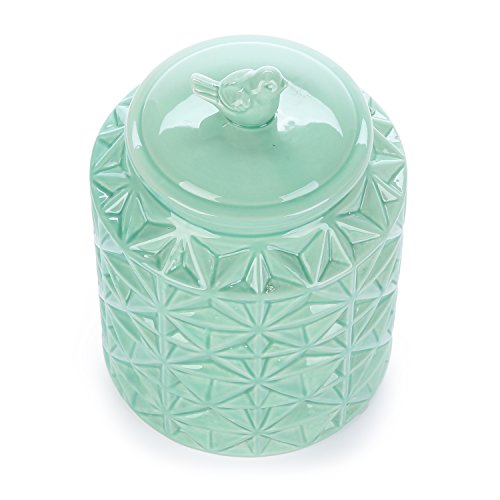 Turquoise Vintage Ceramic Kitchen Flour Canister / Cookie Jar w/ Abstract Star Design & Bird Topped Lid