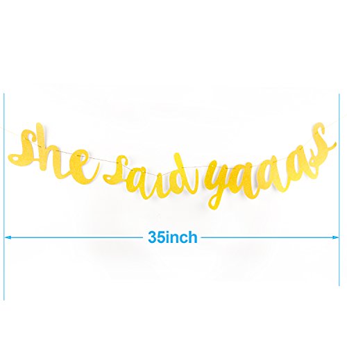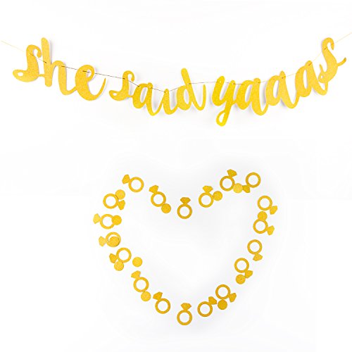 -. Feature : Sparkling cursive glitter letters"She Said Yaaas",perfect for engagement party decorations & supplies. / Size: "She Said Yaaas" size is 3ft,4-5in high,and the ribbon is about 8ft. / Easy to assemble and hang,each square is adjustable,so the spacing could be adjusted that your like. / Package:One She Said Yaaas banner, and also included the extra glittery gold ring confetti to decorate your parties,wedding,all kinds of decoration. / Great for engagement party,bridal shower,bachelorette party,weddings,make your events too specially.