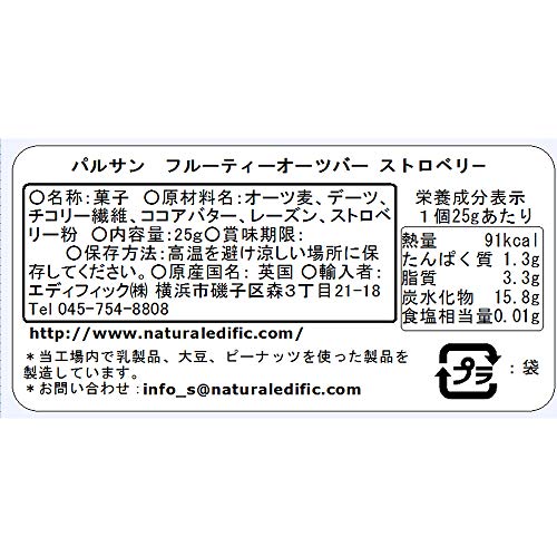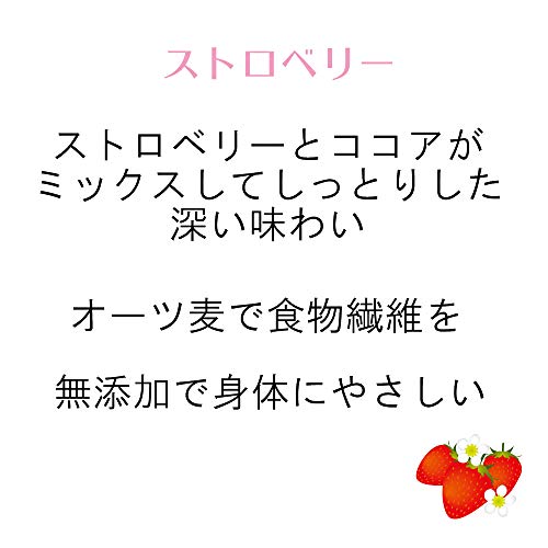 原材料:オーツ麦、デーツ、チコリー繊維、ココアバター、レーズン、ストロベリー粉