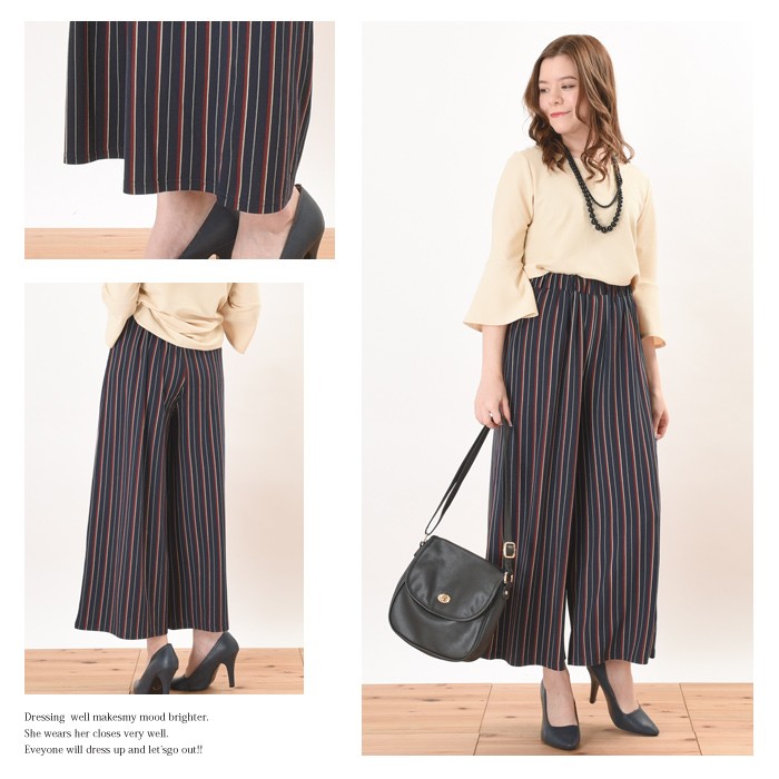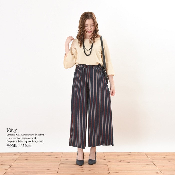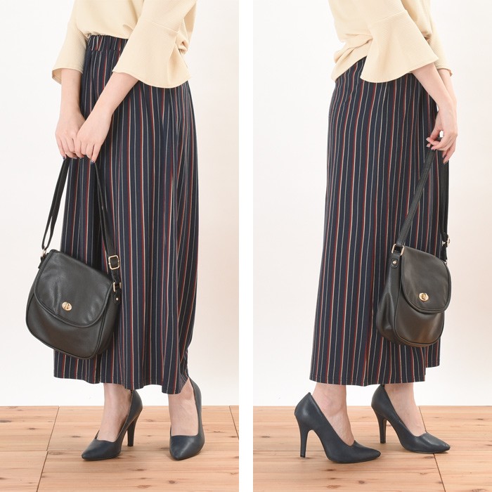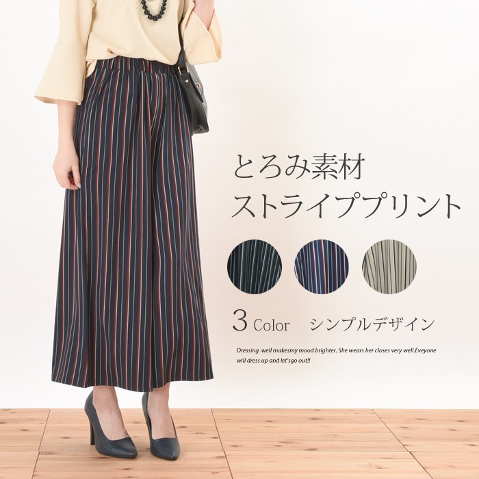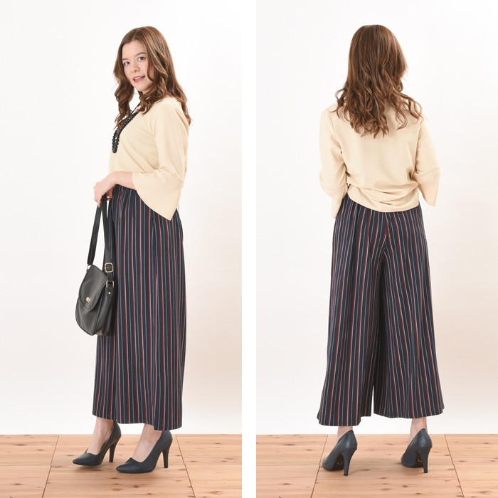 しっかりとした生地感のピーチ素材のガウチョパンツです。オシャレな雰囲気がありインパクト満点なので、シンプルなトップスやアウターと相性抜群で着回しがしやすく幅広い年齢層の方に大人気ですウエスト部分にゴムが入っているのでゆったりと着心地楽ちんで、ワードローブにたっぷりと着回しができますコーディネートのワンポイントになります。Mサイズ Lサイズ